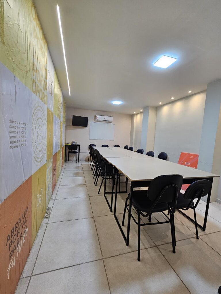 Espaço equipado para reuniões ou capacitações, com área confortável suportando até 25 pessoas.